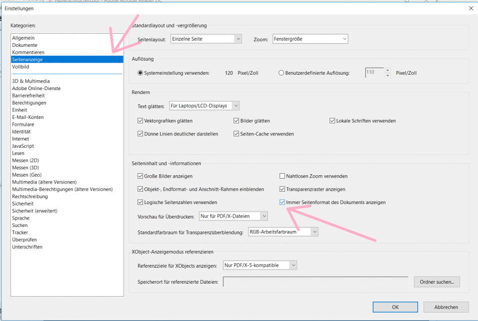 Im Einstellungsfenster klicken Sie bitte links auf Seitenanzeige und setzen Sie den Haken bei „Immer Seitengröße des Dokuments anzeigen“