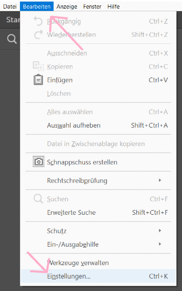 Gehen Sie im Fenster des Adobe Reader auf  Bearbeiten, dann auf Einstellungen.