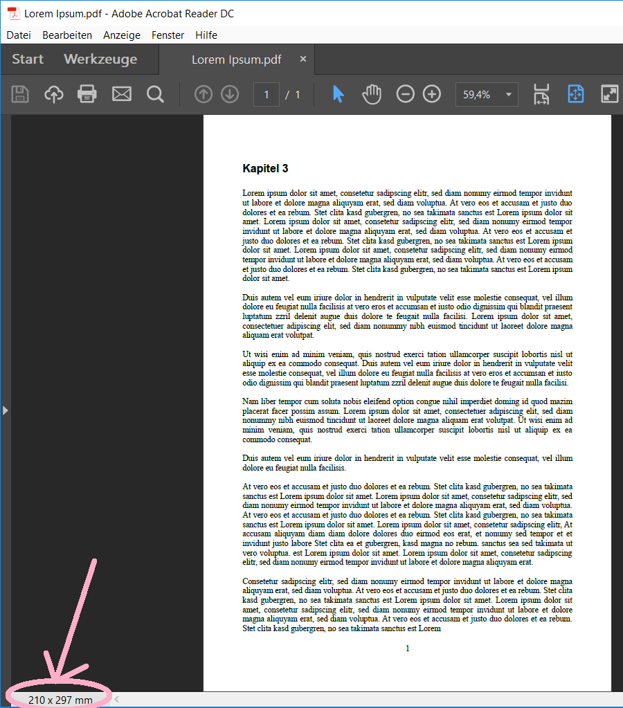Jetzt erscheint unten im Feld  die Seitengröße Ihres Dokumentes.